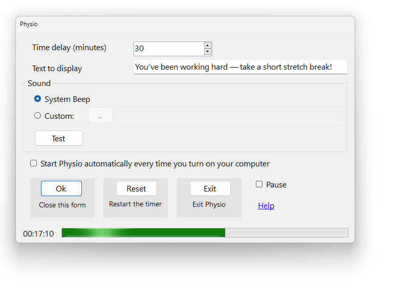 - V okně pro nastavení lze zvolit interval, zobrazovaný text atd. (viz též Ovládání programu níže). Doporučuji zaškrtnou volbu „Start Physio automatically…“. Tím se Physio spustí automaticky při každém zapnutí počítače.