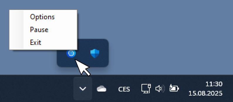 Options: zobrazení okna pro nastavení parametrů programu, tedy totéž co kliknutí levým tlačítkem myši na ikonu. Jen je to delší cesta.